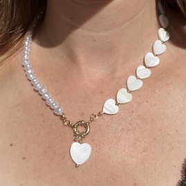 Perles de coquillage nacrées en forme de coeurs et imitation perles d'eau douce.